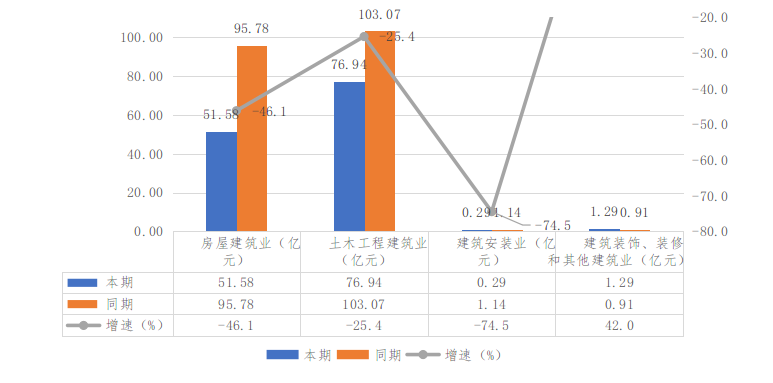 从比重来看,土木工程建筑业完成产值76.94亿元,同比下降25.4%。其中,铁路、道路、隧道和桥梁工程建筑业完成产值68.40亿元,占比最大,占88.9%,同比下降28.5%。