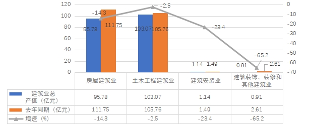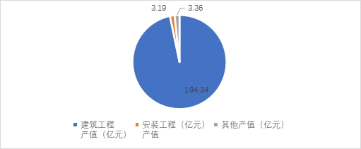 资质内建筑业企业完成建筑工程产值共计194.34亿元,同比下降8.2%,占建筑业总产值的96.7%;安装工程产值完成3.19亿元,同比下降23.5%,占建筑业总产值的1.6%;其他产值完成