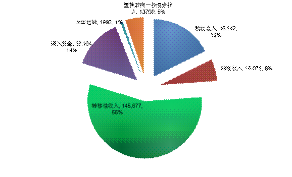全县一般公共预算平衡情况:一般公共预算收入65323万元,加返还性收入、一般性转移支付收入、专项转移支付收入、上年结转、调入资金、待收部门债券利息、再置换政府债券收入等237154万元,收入总计302477万元。一般公共预算支出270806万元,加再置换政府债券支出、上解支出等31671万元,支出总计302477万元。收支平衡。