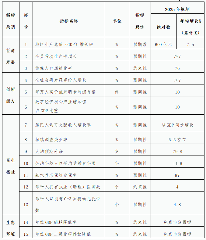 到2025年,全区高质量发展迈出坚实步伐,综合实力全面增强,中心城区龙头地位持续强化,辐射带动作用充分发挥。经济发展实现新突破,全区经济总量跨越600亿,经济结构更加优化,创新能力显著提升,产业基础高级化、产业链现代化水平明显提高,城乡区域发展协调性明显增强;改革开放迈出新步伐,产权制度改革和要素市场化配置改革取得重大进展,公平竞争制度更加健全,产业、科技、人才、资本深度融合,更高水平开放型经济新体制基本形成;生态文明建设取得新成效,国土空间开发保护格局得到优化,生产生活方式绿色转型成效显著,主要污染物排放总量持续减少,生态环境持续改善,生态安全屏障更加牢固,还自然以宁静、和谐、美丽;社会文明程度迈上新台阶,社会主义核心价值观深入人心,群众思想道德素质、科学文化素质和身心健康素质明显提高,公共文化服务体系和文化产业体系更加健全,城乡居民精神文化生活更加丰富;民生福祉达到新水平,高质量就业更加充分,城乡居民收入大幅增长,基本公共服务均等化水平明显提高,全民受教育程度不断提升,多层次社会保障体系更加健全,卫生健康体系更加完善,乡村振兴战略全面推进;治理效能得到新提升,依法治区深入推进,政府职能更好发挥,行政效率和公信力显著提升,社会诚信体系更加健全,基层治理水平明显提高,防范化解重大风险体制机制持续健全,突发公共事件应急能力显著增强,发展安全保障更加有力。“产业兴、经济活,环境优、市场旺,功能强、生活美,治理好、百姓乐”的实景画卷全面铺展,高质量发展、高品位生活、高效能治理相得益彰。