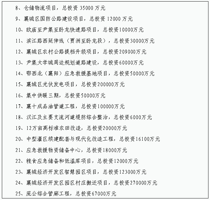 谋划重大项目支撑。抢抓发展机遇,夯实高质量发展基础,重点谋划、推进、建设一批强基础、管长远、利大局的高质量重大项目和工程,形成谋划一批、推进一批、建设一批、见效一批的良好投资机制。充分利用社会资本等新的融资方式,促进民间投资高速增长。强化财税、投资、金融,为加强重点项目建设,为襄城高质量发展增加动力。到2025年,固定资产投资年均增长10%。