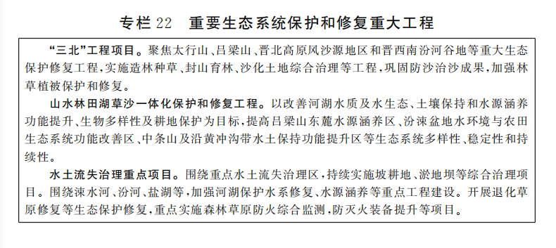 科学开展大规模国土绿化。合理配置林草植被类型和密度,宜林则林、宜草则草。坚持整体保护、系统修复、综合治理,高质量推进“三北”工程六期建设。全面推进黄河“几字弯”、汾河上游等重点区域生态保护修复,布局开展重点领域项目,持续增加森林面积,提升森林质量。加强荒漠化综合治理,推进晋北、晋西北风沙区开展沙化土地和盐碱地综合治理。健全以国家公园为主体的自然保护地体系,推进太行山国家公园候选区创建,提高自然保护地生态产品供给能力。在黄河沿岸、汾河谷地发展特色林草产业,加强古树名木保护。