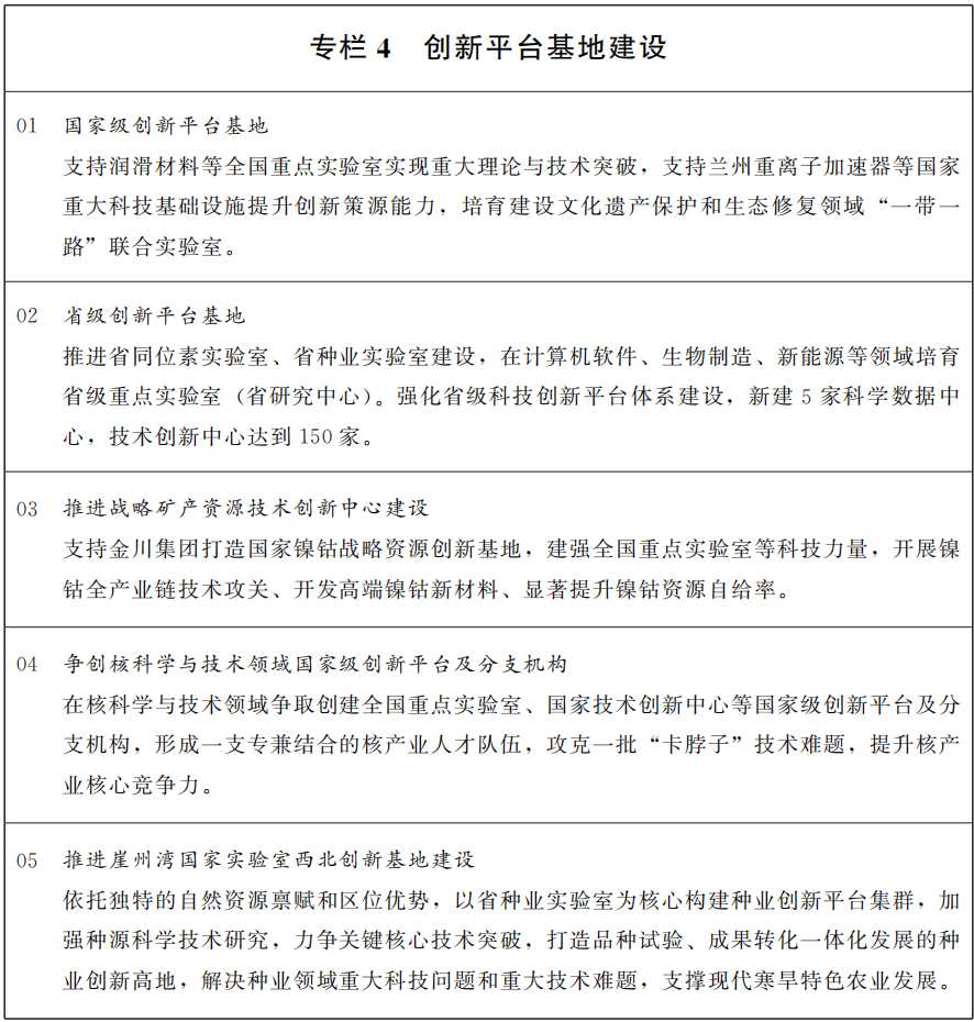科技创新引领焕发新活力。着力推进强科技行动,全社会研发经费投入由2020年的109.6亿元提高到2024年的164.6亿元,重点领域科技攻关取得新突破,具有完全自主知识产权的医用重离子加速器装置打破国际垄断,2兆瓦液态燃料钍基熔盐实验堆达到满功率运行,金川集团手撕镍和4N5无氧铜板材、酒钢集团因瓦合金等产品达到世界水平,兰石集团成功研制我国首台离子液氢气压缩机,催生新质生产力加速壮大。全国重点实验室达到14家,高新技术企业数量实现倍增,技术合同成交额年均增长超过20%,科技进步贡献率由2020年的55.1%提高到2025年的62.03%。