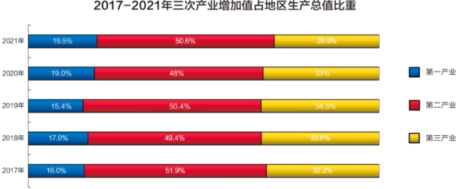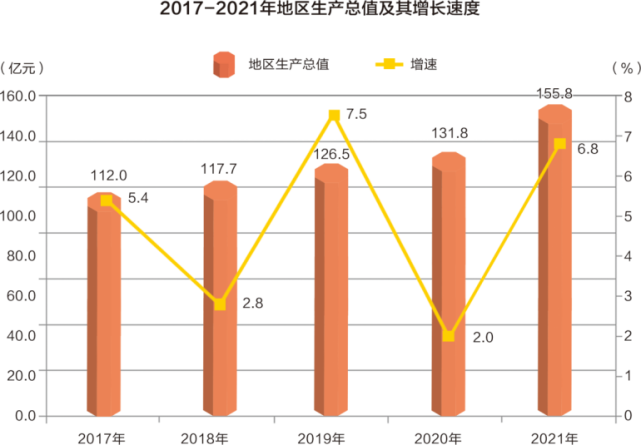 初步核算,2021年全市实现地区生产总值155.8亿元,按不变价计算,比上年增长6.8%。分产业看:第一产业实现增加值30.4亿元,增长8.1%;第二产业实现增加值78.9亿元,增长6.3%;第三产业实现增加值46.5亿元,增长6.7%。三次产业比例为:19.5∶50.6∶29.9。按常住人口计算,人均地区生产总值63588元。