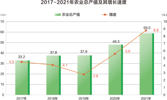全年实现农林牧渔业总产值59亿元,比上年增长8.8%,其中:农业产值32.7亿元,增长10.2%;林业产值662万元,下降29.2%;畜牧业产值23.1亿元,增长11.9%;渔业产值1.7亿元,增长5.1%;农林牧渔服务业产值1.4亿元,增长4.2%。