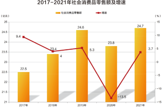 全年实现社会消费品零售总额24.7亿元,比上年增长3.7%。按经营地统计,城镇市场实现社会消费品零售额19.6亿元,比上年增长4.4%;农村市场实现社会消费品零售额5.1亿元,比上年增长0.8%。