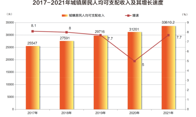 全年城镇居民人均可支配收入33610.2元,同比增加2409.2元,比上年增长7.7%。其中:城镇居民人均工资性收入22443.2元,同比增加75.8元,增长0.3%;人均经营净收入6087.2元,同比增加1733.6元,增长39.8%;人均财产净收入792.8元,同比增加191.2元,增长31.8%;人均转移净收入4287.0元,同比增加408.6元,增长10.5%。