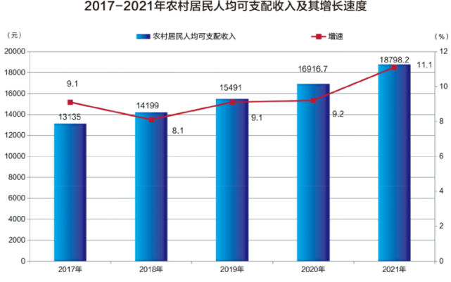 全年农村居民可支配收入为18798.2元,同比增加1881.6元,增长11.1%。其中:农村居民人均工资性收入9556.8元,同比增加1048.1元,增长12.3%;人均经营净收入8105.0元,同比增加738.9元,增长10.0%;人均财产净收入为351.0元,同比增加25.1元,增长7.7%;人均转移净收入785.4元,同比增加69.5元,增长9.7%。