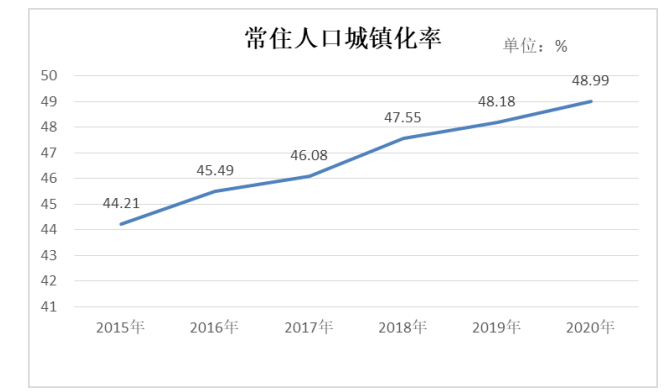 11 | 常住人口城镇化率(%) | 44.21 | 48.99 | 50左右 | [4.78] | 5左右 | 预期性 | 接近完成 | |