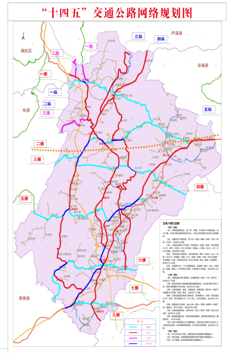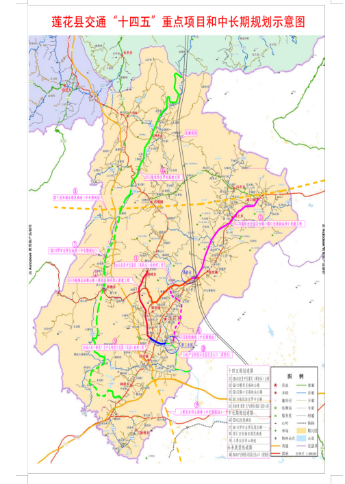 14.“五纵八横三连接一环城”:“五纵”指萍莲高速莲花段、G319国道六市至三岔口、省道S533张佳坊至上江、县乡道芦溪杂溪至永新高溪、G322和G319安福至产业转型示范园;“八横”指湖南攸县至西江村、崇仁至莲花高速莲花段、湖南攸县至路口、荷塘佳山至永新、国道G641山斗岭至高铁站、界化垅至垄山口出永新、泉南高速公路莲花段、三板桥山口垅进吉安永新;“三连接”指S255长丰至六市段、X805湘东拓村至芦溪磨桥段、X207六市至攸县柏市;“一环城”指绕城公路,东绕城线:南湾至产业转型示范园公路;南绕城线:安成大道(寨里)至产业转型示范园(花园村)公路;西绕城线:G319寨里至南岭公路;北绕城线:G641垒里冲至高铁站公路。