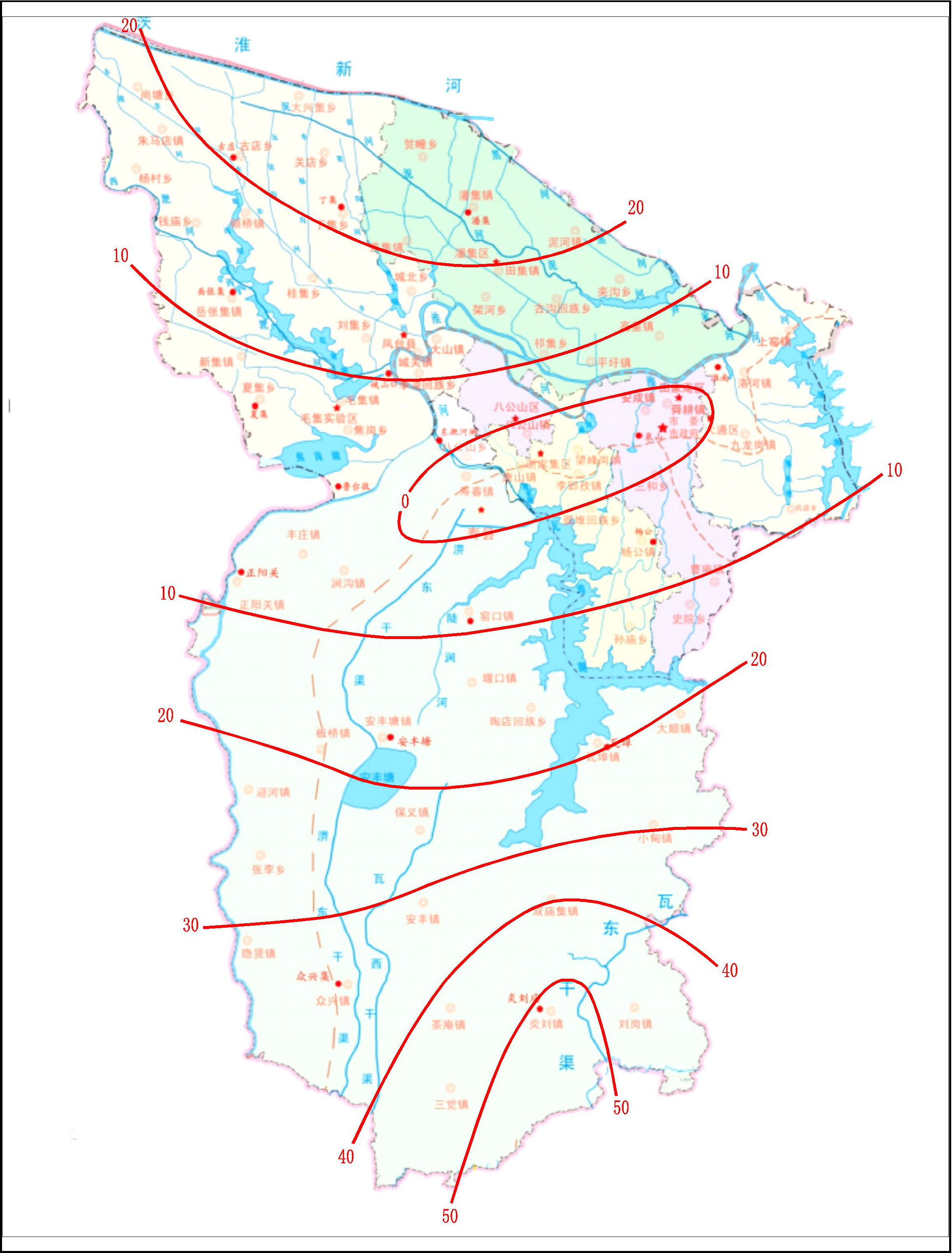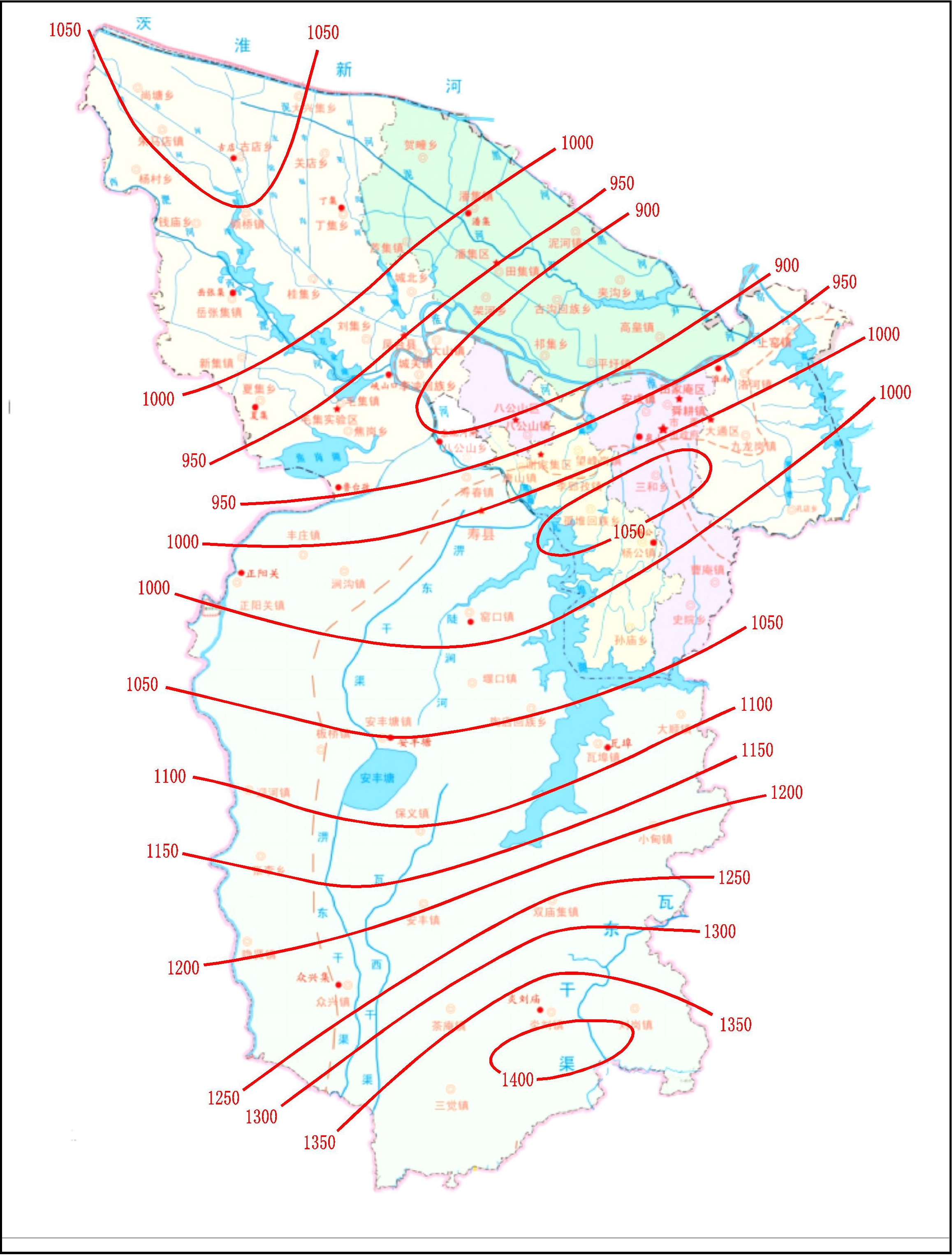 淮南市降水量的空间分布状况:全市降水量空间分布不均,沿淮地区年降水量偏小,而南北降水量偏大,年降水量高值区为寿县中南部,年降水量最大值为寿县炎刘庙站1405.7毫米,年降水量最小值为淮南站844.1毫米。年降水量空间分布见图3。