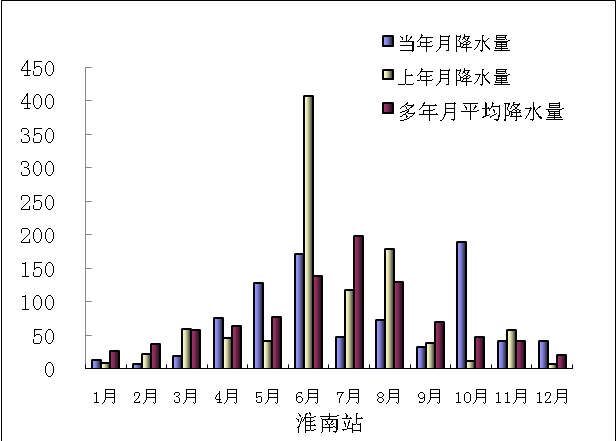 代表站淮南站的年降水量844.1毫米,较上年减少15.8%,比多年均值减少8.4%。1~4月份降水量比多年同期均值偏少37.6%;5~9月份降水量比多年同期均值偏26.1%;10~12月份降水量比多年均值偏多147.4%。1~4月、5~9月、10~12月份降水量分别占年降水总量的13.8%、53.9%、32.3%。