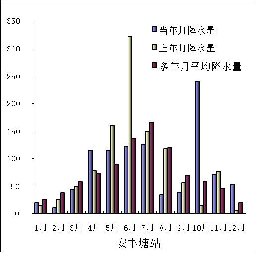 代表站安丰塘站的年降水量988.2毫米,较上年减少7.7%,比多年均值增加10.0%。1~4月份降水量比多年同期均值偏少3.5%;5~9月份降水量比多年同期均值偏少25.0%;10~12月份降水量比多年均值偏多197.3%。1~4月、5~9月、10~12月份降水量分别占年降水总量的19.0%、44.1%、36.9%。代表站当年各月降水量与上年月降水量、多年月均值比较见图5