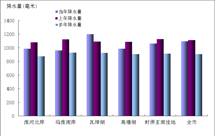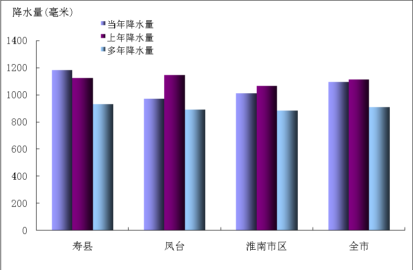 全市当年平均降水量1094.3毫米,较上年少1.6%,较多年平均值多20.3%,属丰水年份。淮河干流凤台(峡山口)站年最高水位22.02米,为有资料以来的第二十六位;淮河干流淮南站年最高水位20.59米,为有资料以来的第三十一位。