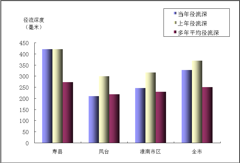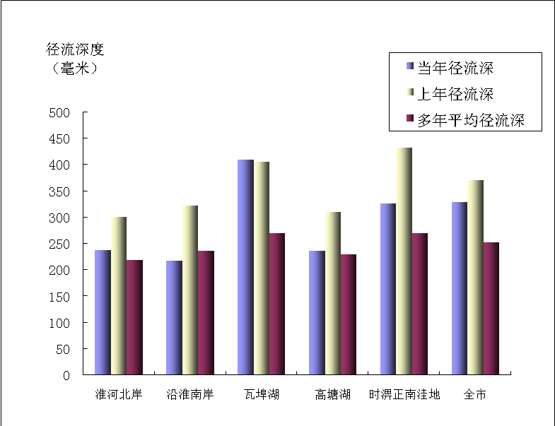 按水资源分区统计,沿淮南岸径流深最小,为216.2毫米;瓦埠湖区最大,为409.3毫米。与上年比较,淮河北岸、沿淮南岸、高塘湖区、时淠正南洼地径流深分别少21.1%、32.8%、24.0%、24.7%,瓦埠湖区多1.2%。与多年平均比较,淮河北岸、沿淮南岸、瓦埠湖区、高塘湖区、时淠正南洼地分别多8.3%、52.0%、2.8%、21.0%,沿淮南岸少8.0%。各水资源分区地表水资源量与上年、多年平均的比较情况(以径流深表示)见图6。