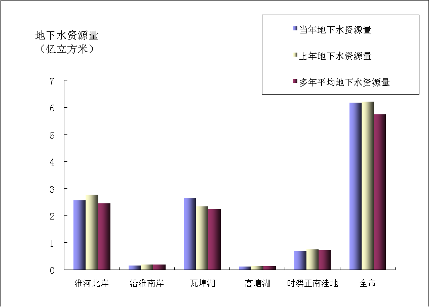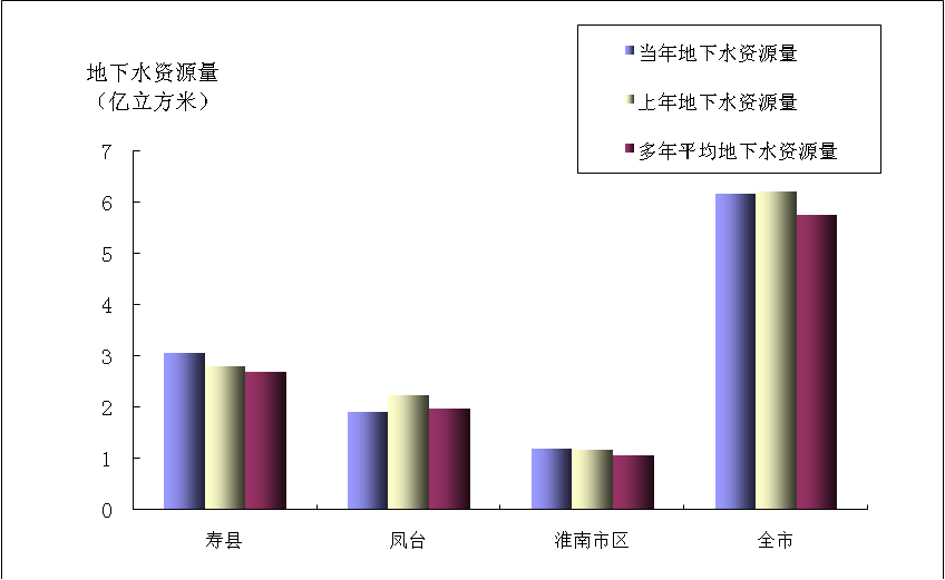全市地下水资源总量6.17亿立方米。其中,淮河北岸、沿淮南岸、瓦埠湖区、高塘湖区、时淠正南洼地地下水资源量分别为2.57亿立方米、0.15亿立方米、2.64亿立方米、0.12亿立方米、0.69亿立方米,各水资源分区地下水资源量与上年、多年均值比较情况见图8。行政分区地下水资源量寿县为3.06亿立方米、凤台(含毛集)为1.92亿立方米、淮南市区为1.19亿立方米,各行政分区与上年、多年均值比较情况见图9。