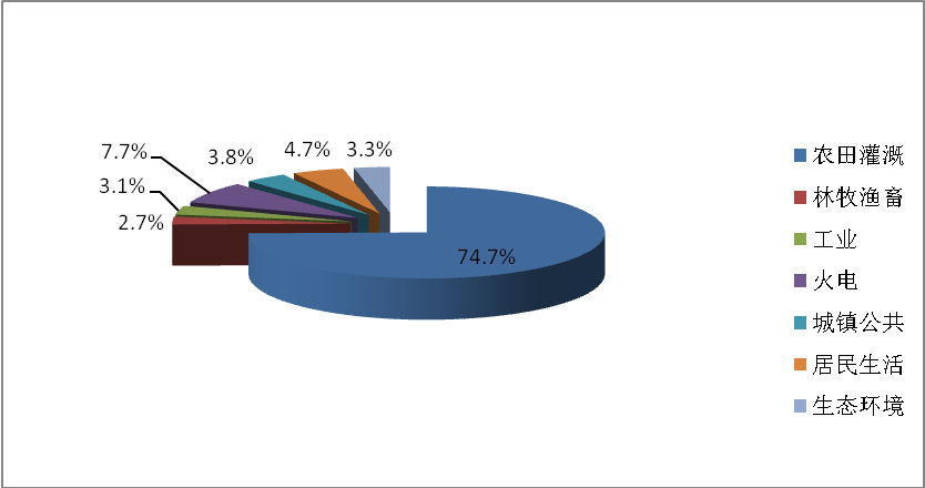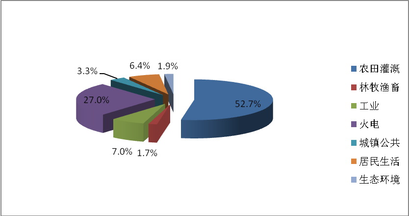 全市总用水量为22.56亿立方米。其中农田灌溉用水量11.89亿立方米,林牧渔畜用水量0.393亿立方米,工业用水量7.67亿立方米,城镇公共用水量0.737亿立方米,居民生活用水量1.453亿立方米,生态环境用水量0.421亿立方米。各水资源分区和行政分区用水量分别见表9和表10,总用水量组成比例见图10。