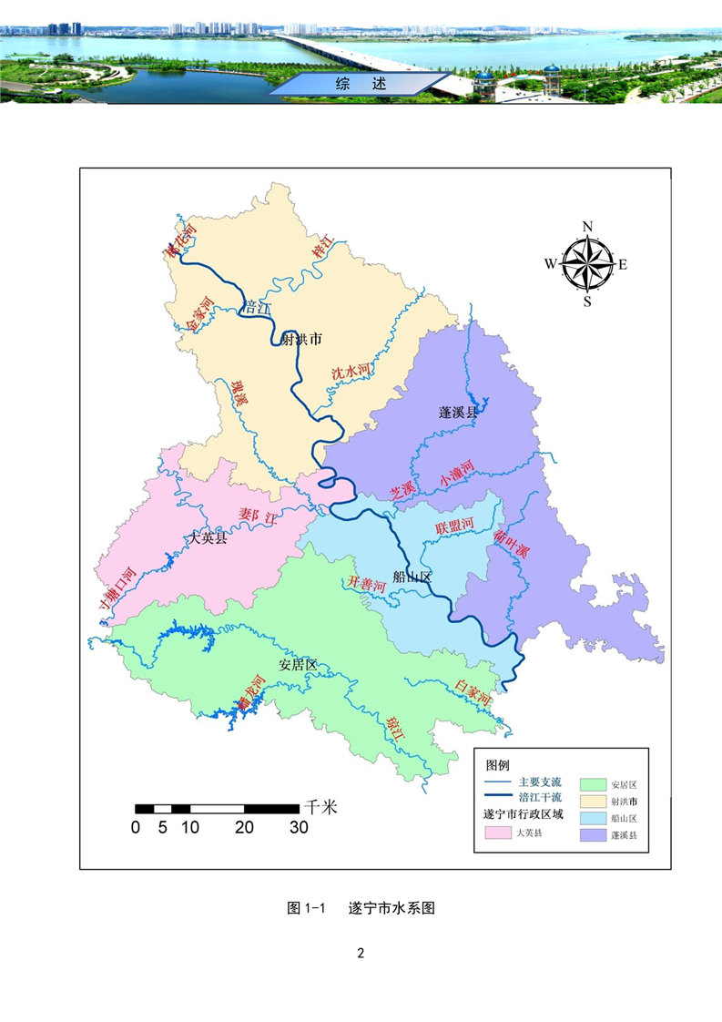 遂宁市位于四川盆地中部,涪江中游,分为涪江和广元昭化以下干流两个水资源三级分区。幅员面积5322平方公里。遂宁市中小河流众多,以涪江干流为主,其中境内流域面积在100平方公里以上的支流有梓江、琼江、郪江、芝溪河、沈水河、蟠龙河、西眉河、荷叶溪、联盟河、开善河等。遂宁市境内主要河流见图1-1。涪江全长660公里,遂宁境内长度171公里。遂宁市水资源评价面积5322km2。