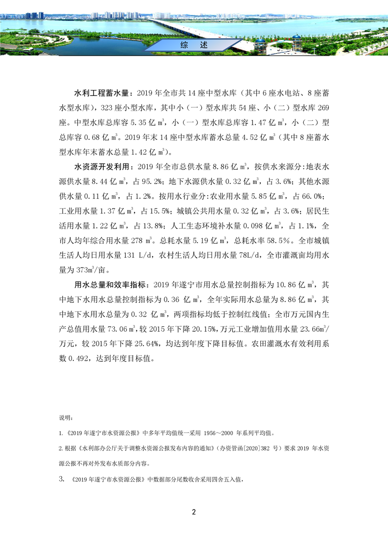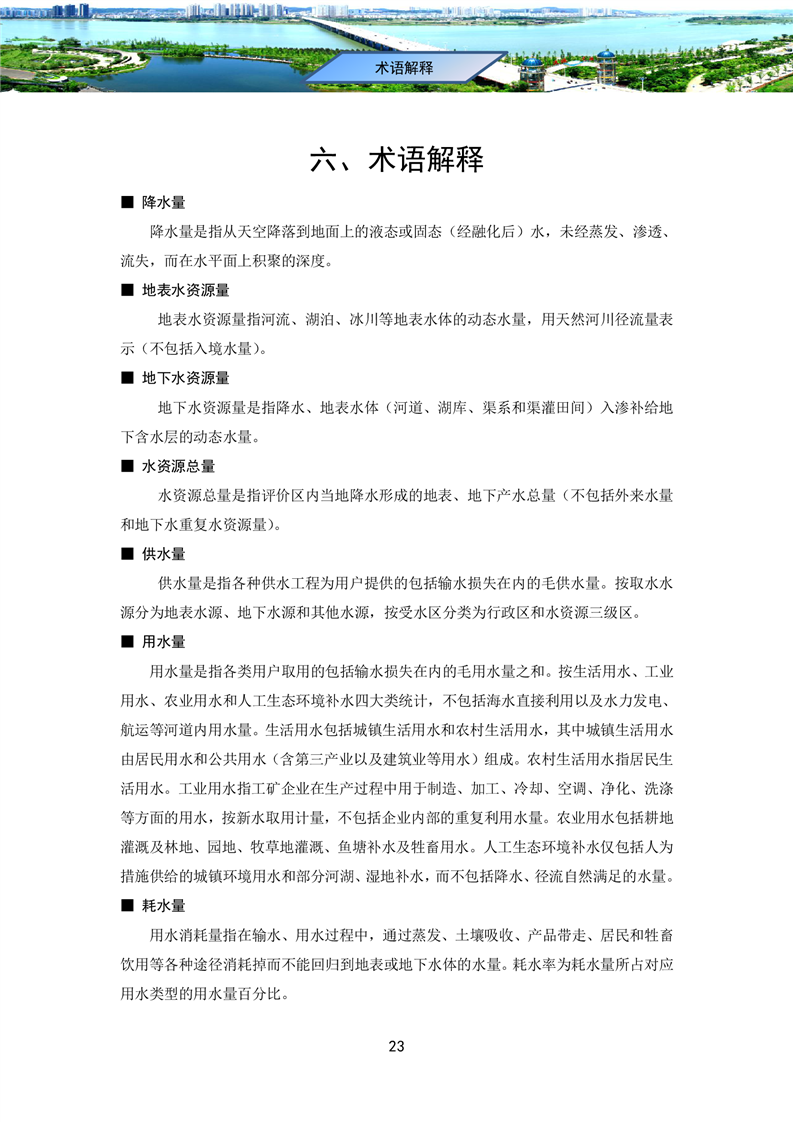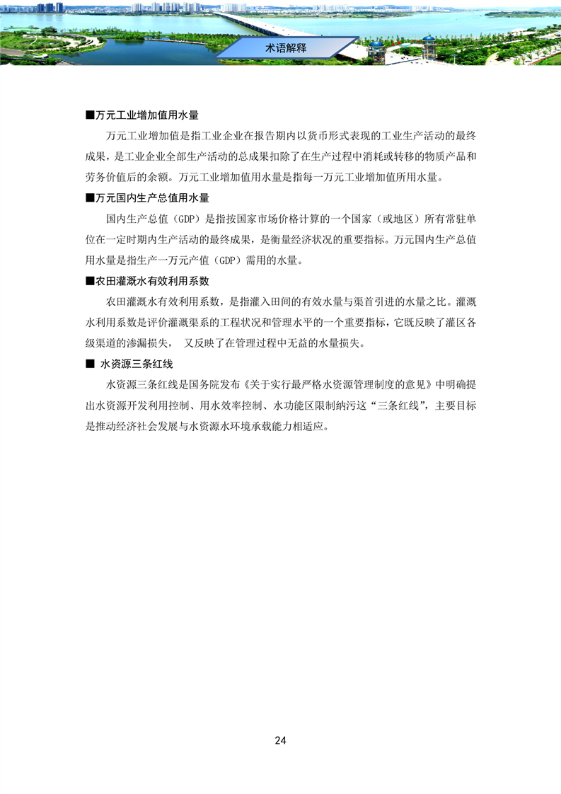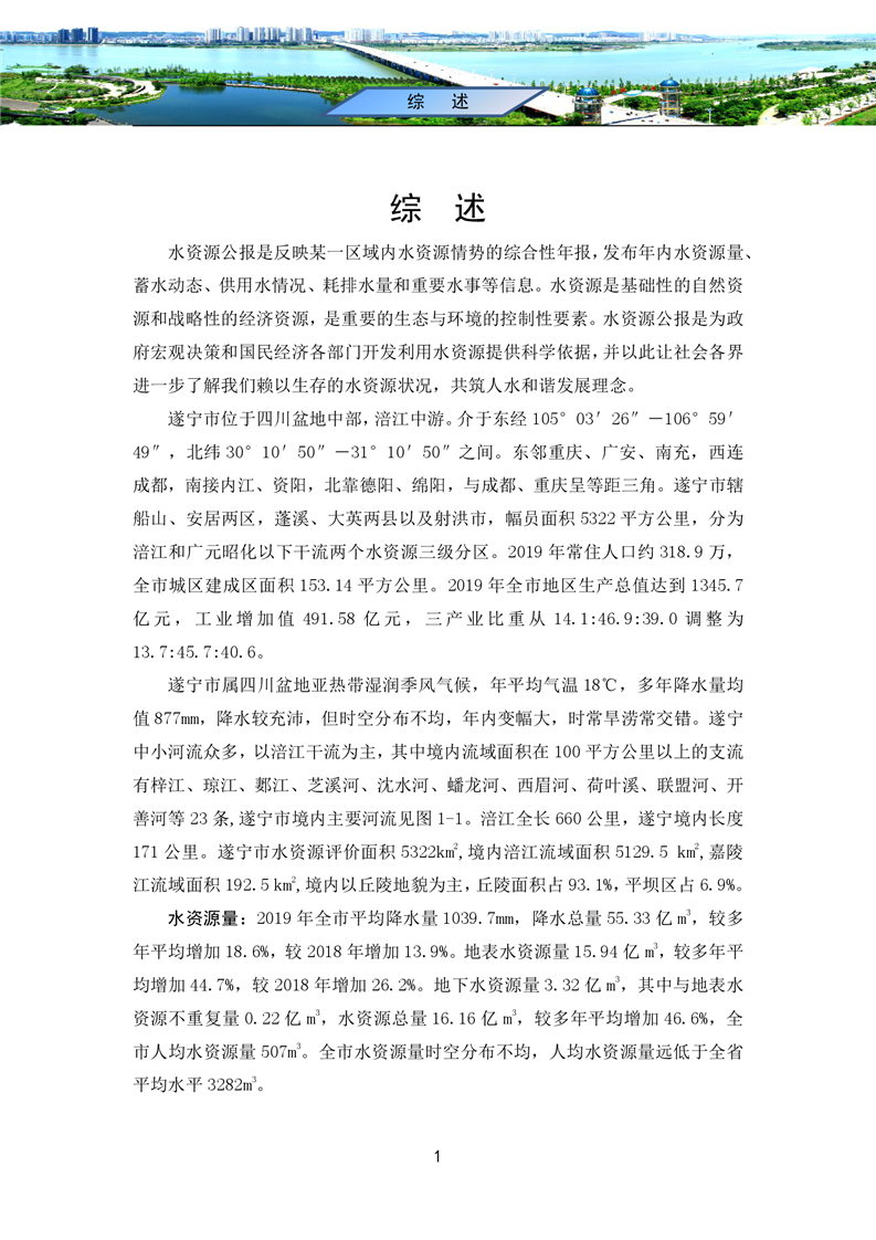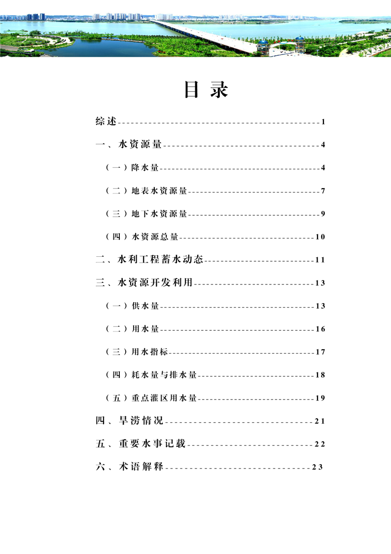 水资源公报是反映某一区域内水资源情势的综合性年报,发布年内水资源量、蓄水动态、供用水情况、耗排水量和重要水事等信息。水资源是基础性的自然资源和战略性的经济资源,是重要的生态与环境的控制性要素。水资源公报是为政府宏观决策和国民经济各部门开发利用水资源提供科学依据,并以此让社会各界进一步了解我们赖以生存的水资源状况,共筑人水和谐发展理念。