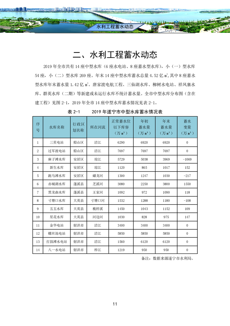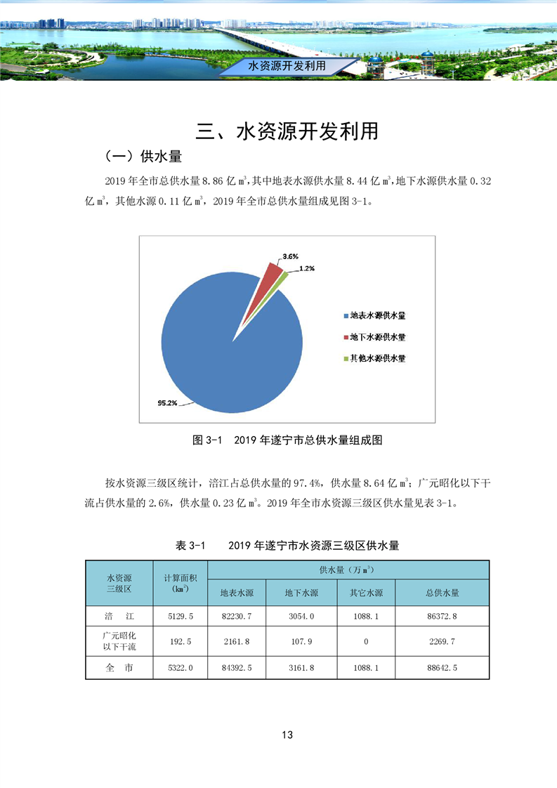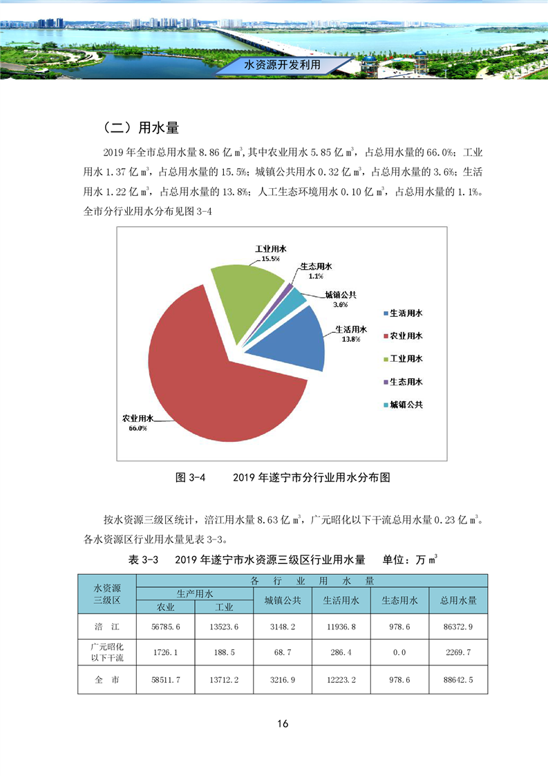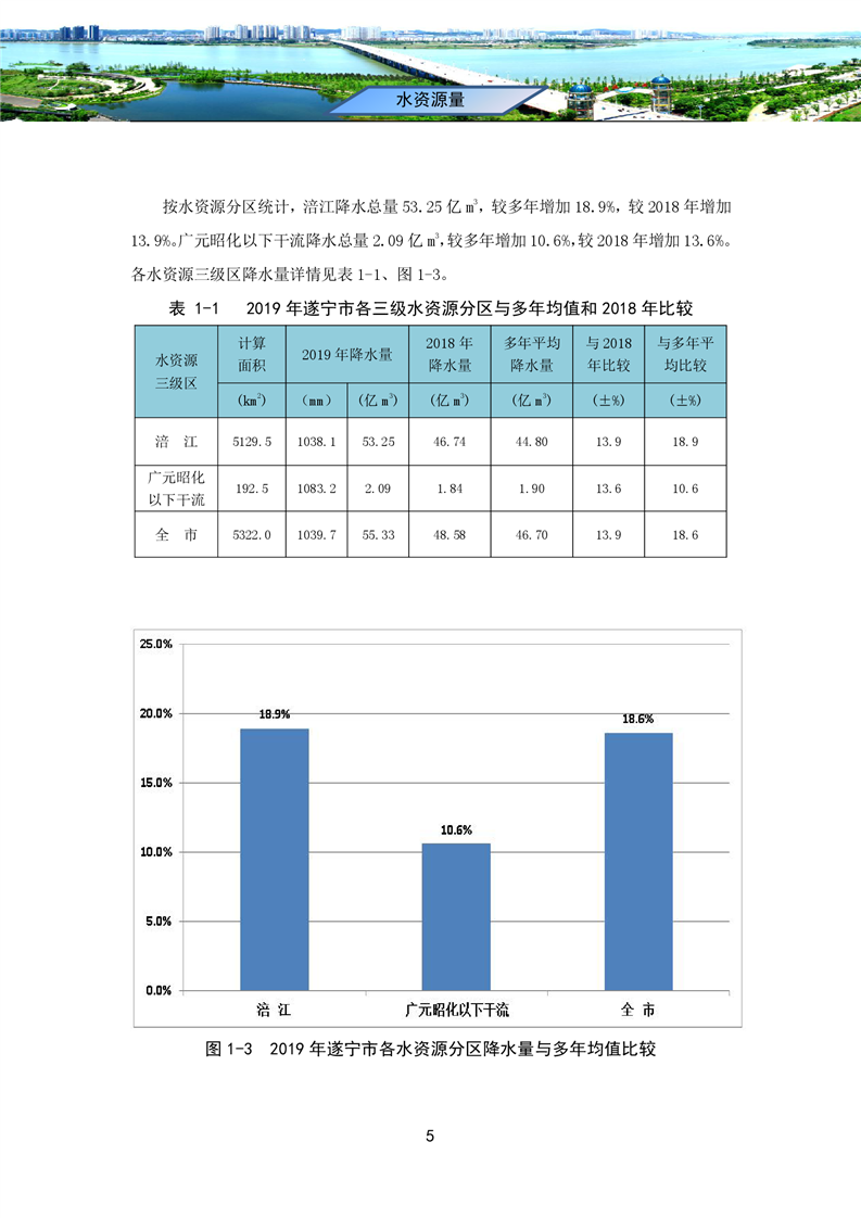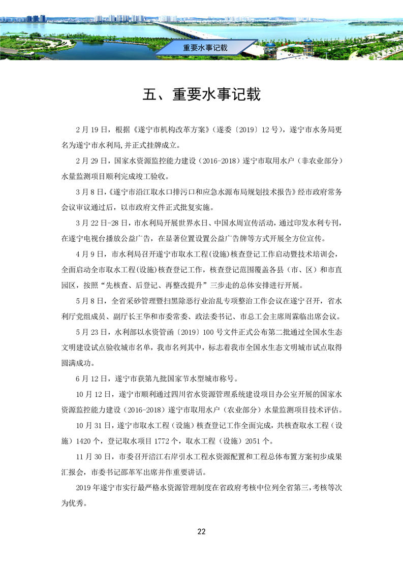 水资源公报是反映某一区域内水资源情势的综合性年报,发布年内水资源量、蓄水动态、供用水情况、耗排水量和重要水事等信息。水资源是基础性的自然资源和战略性的经济资源,是重要的生态与环境的控制性要素。水资源公报是为政府宏观决策和国民经济各部门开发利用水资源提供科学依据,并以此让社会各界进一步了解我们赖以生存的水资源状况,共筑人水和谐发展理念。
