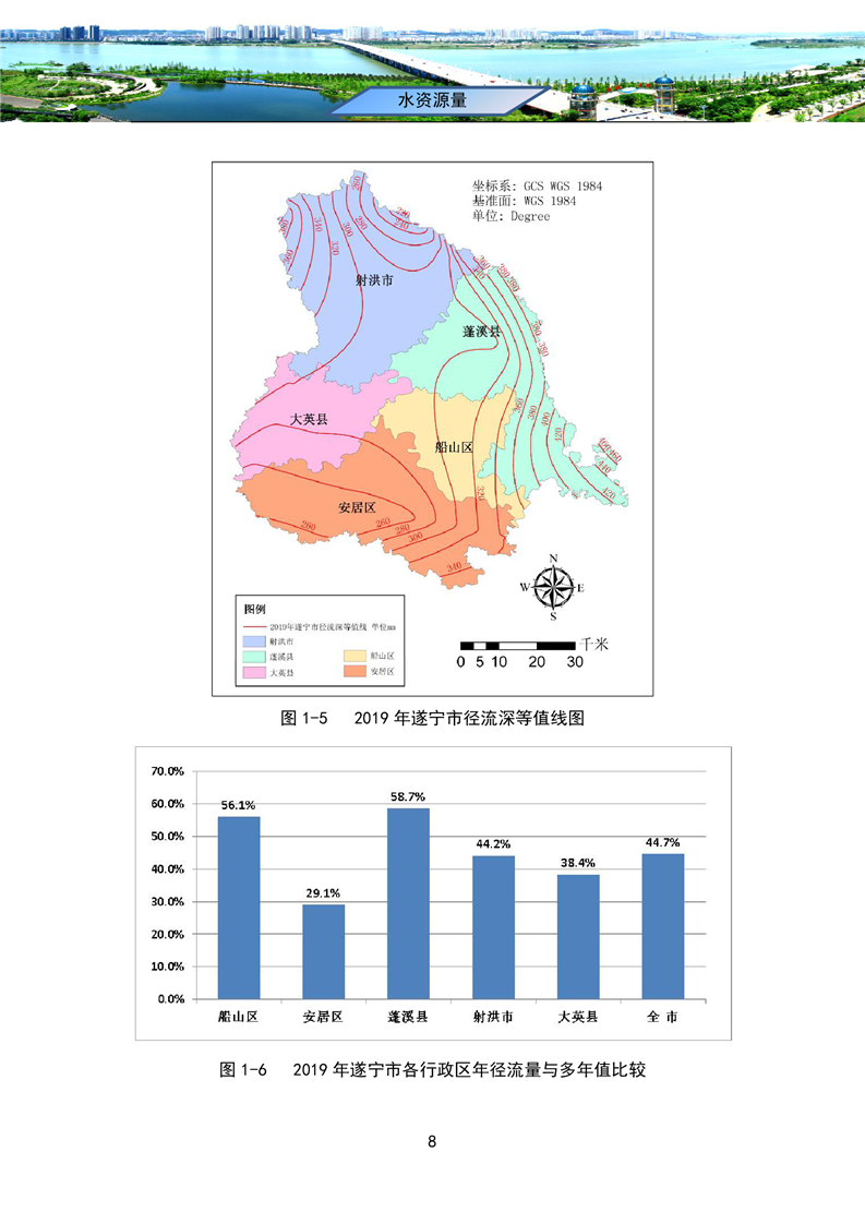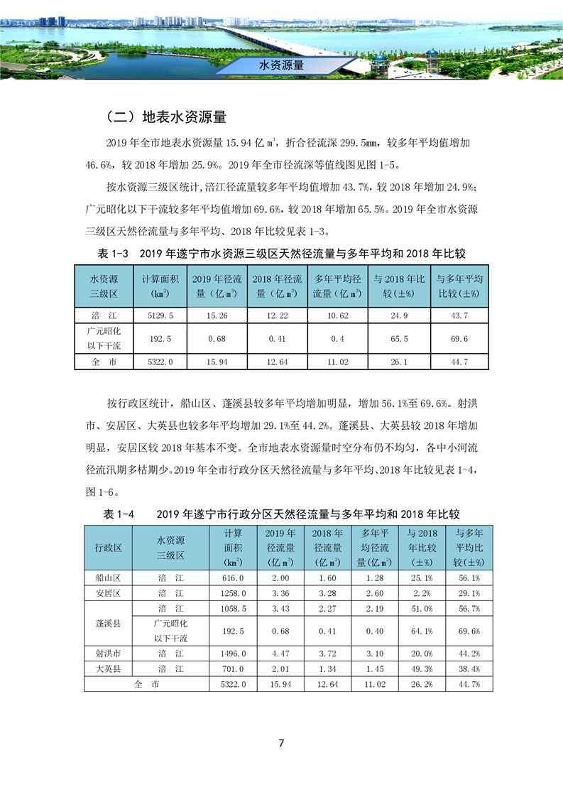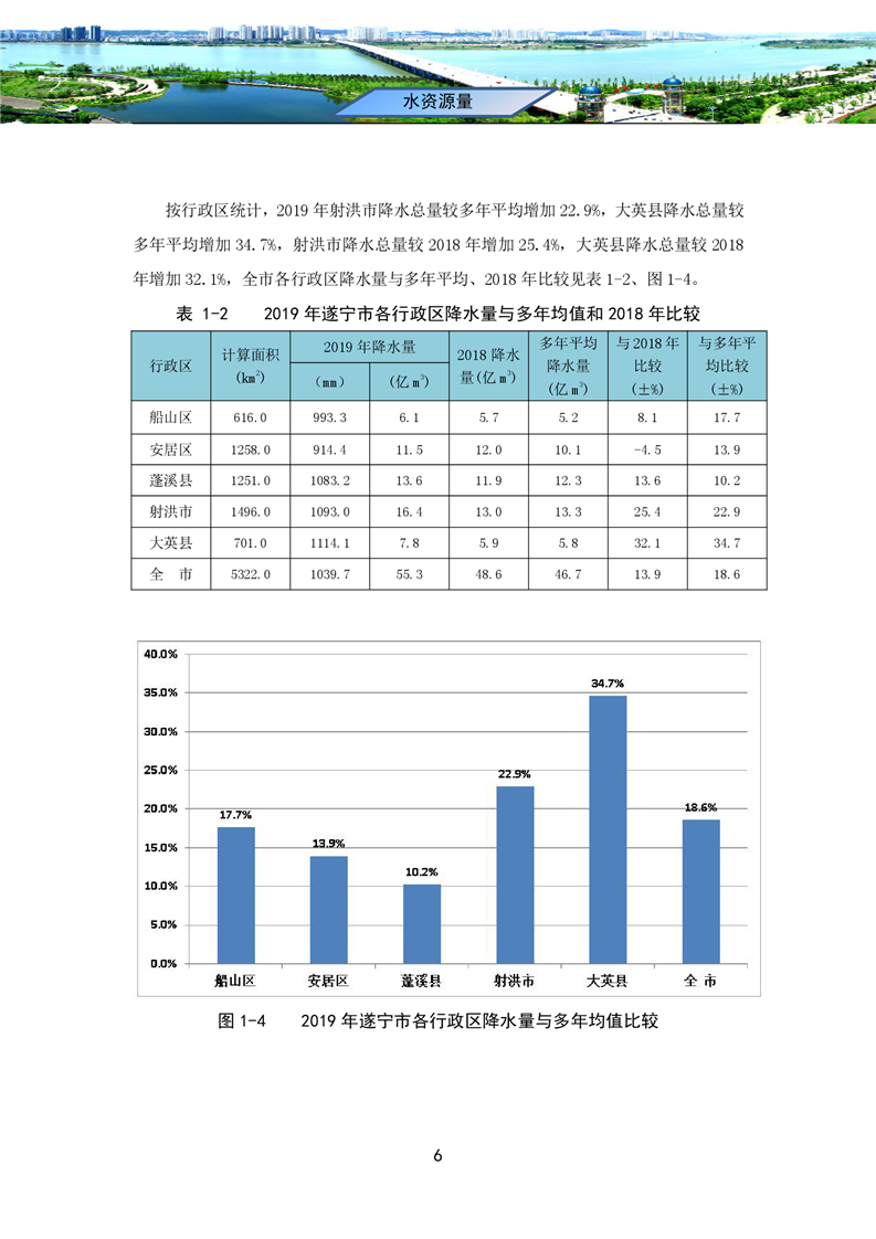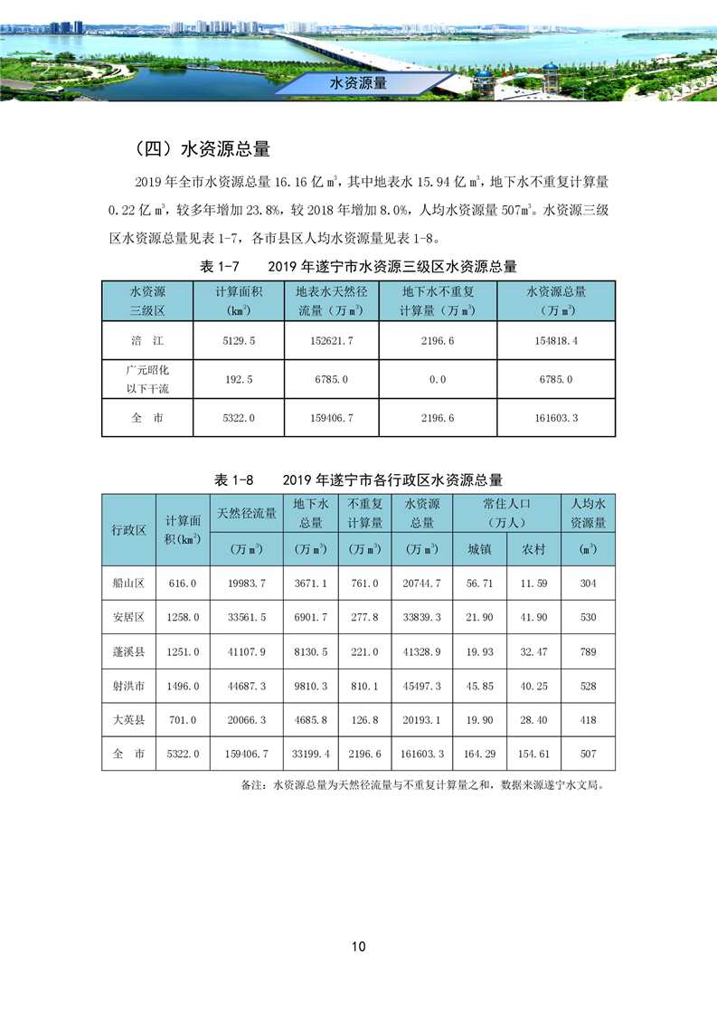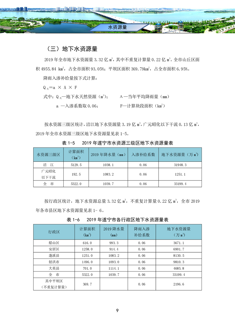 水资源量∶2019年全市平均降水量1039.7mm,降水总量55.33亿m³,较多年平均增加18.6%,较2018年增加13.9%。地表水资源量15.94亿m³,较多年平均增加44.7%,较2018年增加26.2%。地下水资源量3.32亿m3,其中与地表水资源不重复量0.22亿m³,水资源总量16.16亿m²,较多年平均增加46.6%,全市人均水资源量507m。全市水资源量时空分布不均,人均水资源量远低于全省平均水平3282m3。