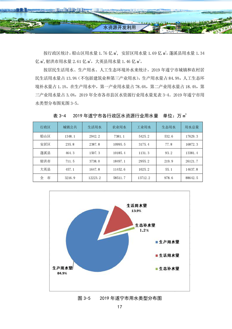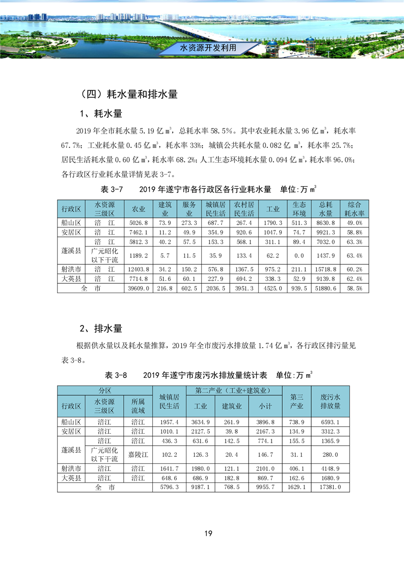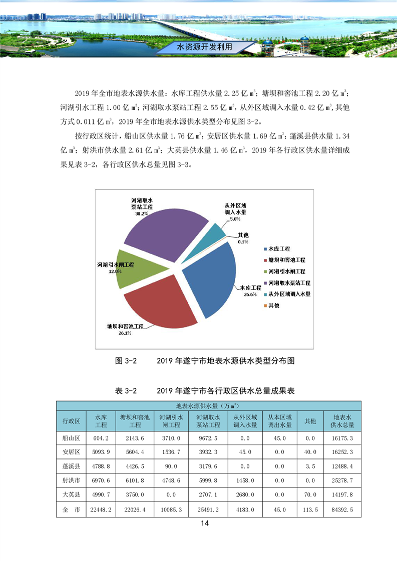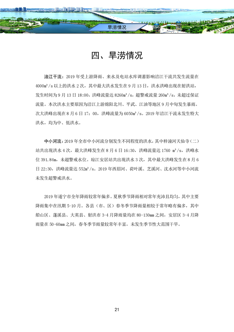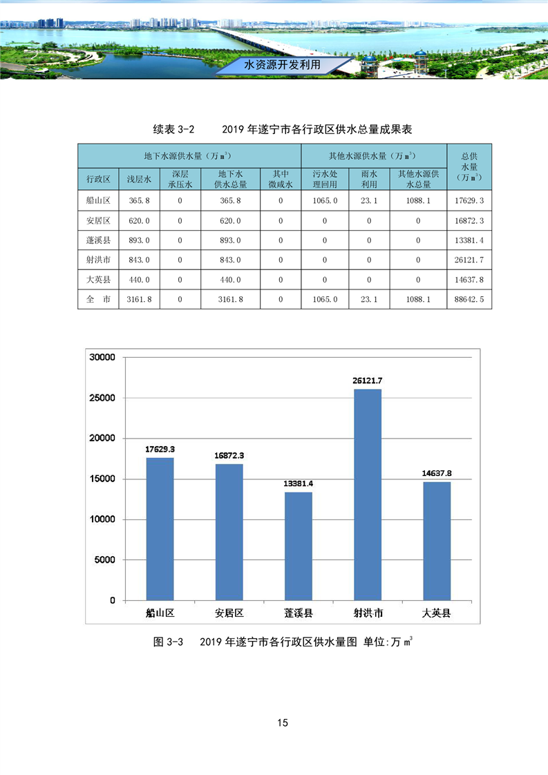 水资源量∶2019年全市平均降水量1039.7mm,降水总量55.33亿m³,较多年平均增加18.6%,较2018年增加13.9%。地表水资源量15.94亿m³,较多年平均增加44.7%,较2018年增加26.2%。地下水资源量3.32亿m3,其中与地表水资源不重复量0.22亿m³,水资源总量16.16亿m²,较多年平均增加46.6%,全市人均水资源量507m。全市水资源量时空分布不均,人均水资源量远低于全省平均水平3282m3。