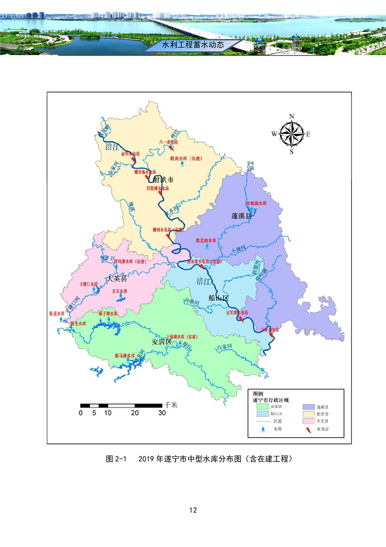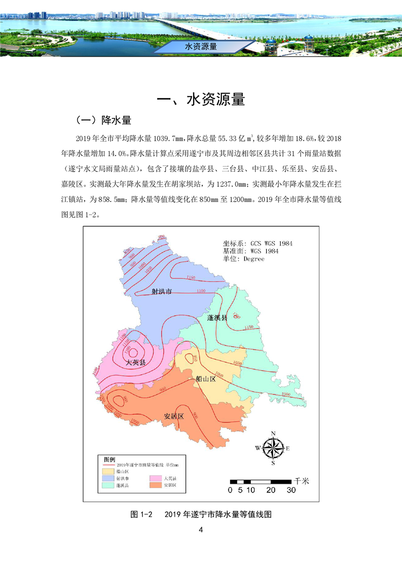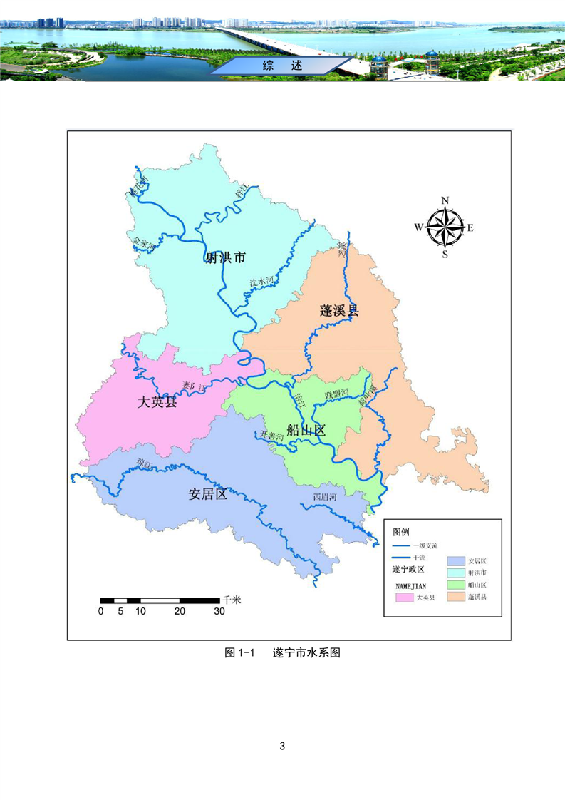 遂宁市属四川盆地亚热带湿润季风气候,年平均气温18℃,多年降水量均值877mm,降水较充沛,但时空分布不均,年内变幅大,时常旱涝常交错。遂宁中小河流众多,以涪江干流为主,其中境内流域面积在100平方公里以上的支流有梓江、琼江、郪江、芝溪河、沈水河、蟠龙河、西眉河、荷叶溪、联盟河、开善河等23条,遂宁市境内主要河流见图1-1。涪江全长660公里,遂宁境内长度171公里。遂宁市水资源评价面积5322km,境内涪江流域面积5129.5km,嘉陵江流域面积192.5km3,境内以丘陵地貌为主,丘陵面积占93.1%,平坝区占6.9%。