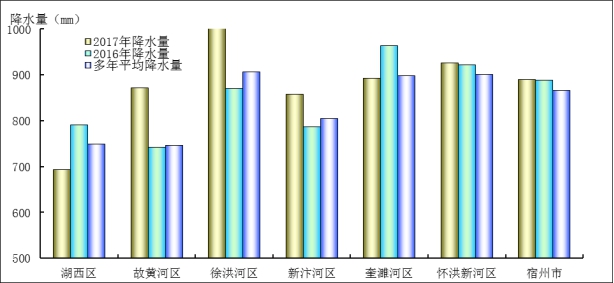 2017年各水资源分区降水状况为,湖西区降水693.7mm,故黄河区降水871.1mm,徐洪河区降水1024.9mm,新汴河区降水858.1mm,奎濉河区降水892.9mm,怀洪新河区降水925.5mm。各水资源分区2017年降水量与2016年和多年平均值比较,见表1、图1。