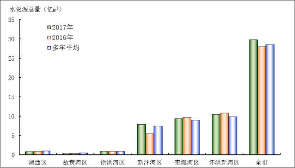 2017年全市水资源总量为29.78亿m3,比2016年多6.3%,较多年平均值多4.5%。其中,地表水资源量15.47亿m3,与2016年相比多3.3%,较多年平均值少4.3%;地下水资源量18.05亿m3,比2016年多6.4%,较多年平均值多10.2%。