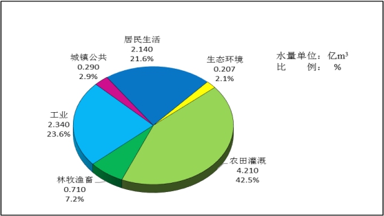 全市2017年总用水量9.90亿m3,较2016年用水量减少0.27亿m3,总用水量组成见图10。