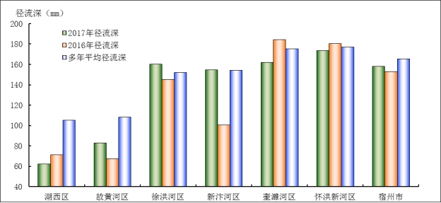 图5 2017年宿州市行政分区径流深与2016年和多年平均值比较