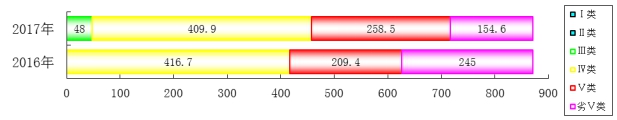 与2016年相比,Ⅲ类河段增加48.0km,Ⅳ类河段减少6.8km,Ⅴ类河段增加49.1km,劣Ⅴ类河段减少90.4km,水质总体有所改善。2017年与2016年不同类别水质河流长度比较示意见图12。各河流水质分别如下。
