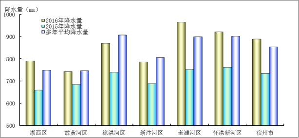 图8 2016年宿州市水资源分区水资源总量与2015年和多年平均值比较2016年安徽省宿州市水资源公报