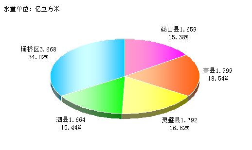 砀山县、萧县、灵璧县、泗县和埇桥区2011年地表水资源量,依次为1.623亿立方米、2.073亿立方米、3.134亿立方米、3.013亿立方米和3.987亿立方米,分别占全市总量11.7%、15.0%、22.7%、21.8%、和28.8%。2011年安徽省宿州市水资源公报 2011年各行政区地表水资源量与上年和多年平均比较情况见表6、图7。2011年安徽省宿州市水资源公报 表6 2011年宿州市行政分区地表径流量与上年和多年平均比较工程资料_模版下载_统计公报 | 行政分区大牛工程师 | 面积 (平方公里)2011年安徽省宿州市水资源公报 | 当年 地表径流量(亿立方米)资料下载_资料共享_十四五 | 当年 地表径流深 (毫米)工程资料_模版下载_工作报告 | 上年 地表径流量 (亿立方米)2011年安徽省宿州市水资源公报 | 多年平均 地表径流量(亿立方米)大牛工程师 | 与上年比较(±%)大牛工程师 | 与多年平均比较(±%)工程资料_工作报告_县域经济 | |
