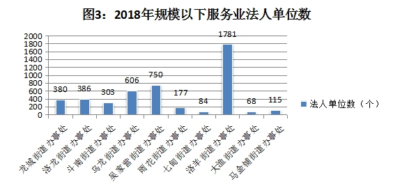 分区域看,托管的洛羊街道占主导地位。根据2018年四经普数据显示,呈贡规模以下服务业企业数共4650家。实际管辖2602家,占55%,托管街道2048家占45%,其中托管经开区的洛羊街道1781家,占全区比重高达38.3%,占比最大。(详见图3)