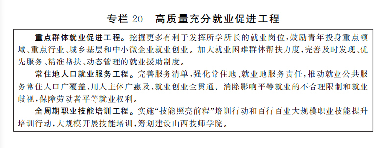 健全终身职业技能培训制度。完善人力资源供需匹配机制,着力解决结构性就业矛盾。完善贯穿劳动者学习工作终身、覆盖职业生涯全程的技能培训制度。加强高技能人才培训基地建设,构建以市场化培训为主导、行业企业自主培训为主体的职业技能培训供给体系。完善劳务品牌发现培育、发展提升、壮大升级的促进机制和支持体系,打造家政服务、护理护工、烹饪烹调、建筑物流、非遗传承等劳务品牌,推动阳泉数智工、榆社古建工匠、吕梁山护工、永济面师等省级劳务品牌建设提质升级。