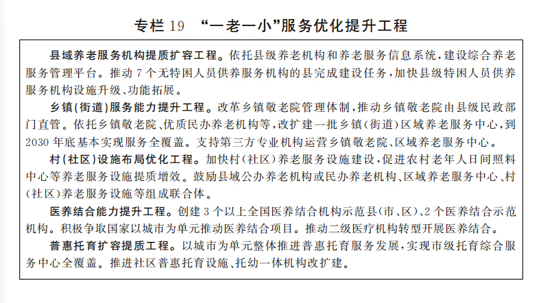 完善城乡养老服务网络。优化基本养老服务供给,推进区域养老服务中心建设,加快健全覆盖城乡的县乡村三级养老服务网络。有序推进养老机构分类改革,健全公办养老机构运营机制。大力发展社区嵌入式养老服务,以助餐、助浴、助洁、助行、助急和助医服务为重点,培育一批专业化、连锁化、品牌化运营的社区养老服务机构。积极发展农村互助性养老服务。发展家庭养老床位。建立养老从业人员培训机制,设立省、市、县三级养老服务人才培训基地,定期开展养老服务人员职业技能培训。推行长期护理保险,健全失能失智老年人照护体系。发展医养结合服务,扩大康复护理服务供给。提升养老服务综合监管质效。