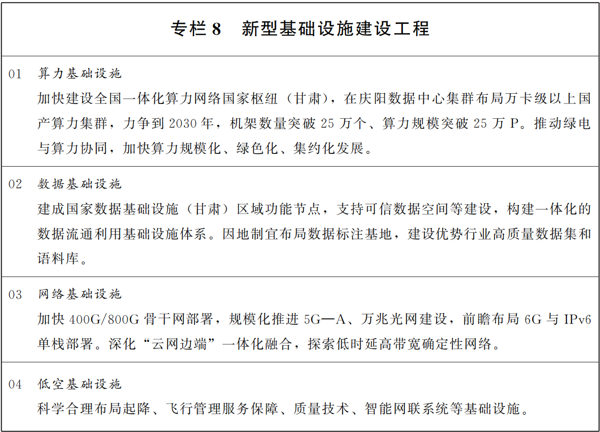 基础设施建设跃上新台阶。综合交通体系建设成效显著,中兰客专、兰张三四线中武段、酒额铁路等建成通车,兰合铁路、西成铁路、兰张三四线武张段、平庆铁路、天陇铁路加快建设,新增铁路里程639公里;“三大高速公路新通道”和“甘川新通道”项目开工建设,新增通高速县市15个,新增高速和一级公路2600公里;兰州中川机场三期、嘉峪关酒泉机场改扩建、华池通用机场建成运营,航空旅客吞吐量超过2100万人次。水利建设润泽陇原,水网规划体系逐步完善,引洮二期骨干及城乡配套工程、甘肃中部供水等一批骨干水网、民生水利工程建成通水,景电灌区现代化改造、阿克塞生态保护和城乡供水等工程开工建设,新增工程供水能力9.83亿立方米。能源建设突飞猛进,电力总装机达到1.24亿千瓦、是2020年的2.2倍,新能源装机8042万千瓦、年发电量963亿千瓦时,分别是2020年的3.4倍、2.5倍,新能源装机、发电量占比分别达到64.6%、37.4%,均居全国前列,陇电入鲁外送工程建成投运,陇电入浙外送工程全面开工;煤炭产能、产量分别增加4749万吨/年、2751万吨;建成陇东千万吨油气生产基地,原油、天然气产量分别增加301.9万吨、5.5亿立方米。新基建扩面增效,“双千兆”网络实现乡镇以上区域全覆盖、5G网络覆盖95%以上行政村,庆阳数据中心集群智能算力规模达到11.4万P,在全国八大枢纽节点中算力增速最快、智算占比最高、消纳最充分。