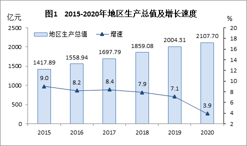 根据地区生产总值统一核算结果,全年全市实现地区生产总值2107.70亿元,同比增长3.9%。分季度看,一季度同比下降1.3%,二季度增长3.8%,三季度增长5.5%,四季度增长6.5%。分产业看,第一产业394.20亿元,增长4.2%,第二产业674.08亿元,增长5.1%,第三产业1039.42亿元,增长3.1%。