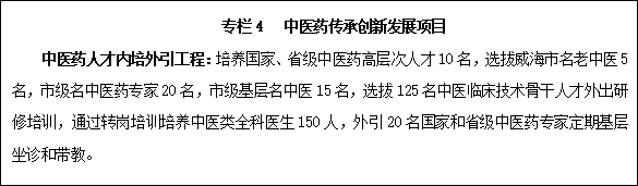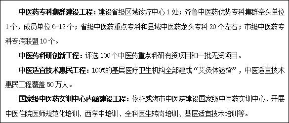 17.深化中医药综合改革。推动中医药体制机制创新,全面健全完善符合中医药发展规律的财政投入机制、医保支付机制、医疗保障机制,依托国家中医药综合改革试验区,争创省级中医药综合改革先行市。加快优质中医医疗资源扩容和均衡布局,统筹推进“一中心、一平台、三大项目”建设,依托威海市中医院建设省级区域中医医疗中心,带动区域中医医疗服务能力全面提升;省市共建山东省文登整骨医院,搭建国家级中医骨伤循证能力建设平台;完成威海市中医院国家中医特色重点医院建设项目、环翠区二级中医医院建设项目和乳山市中医院整体搬迁项目。推进中医药系统集成改革,中药饮片集中配送中心建设提档升级,全面提升中药饮片质量;健全符合中医药特点的医保支付方式,形成“中医服务价格动态调整+中医优势病种按病种付费+中医日间病房特色服务+中医门诊统筹支付”相结合的全方位、立体化的中医医疗保障服务体系。