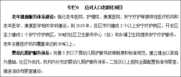 21. 二级及以上综合性医院设置老年医学科的比例 | % | 66.7 | 80 | 预期性 | |
