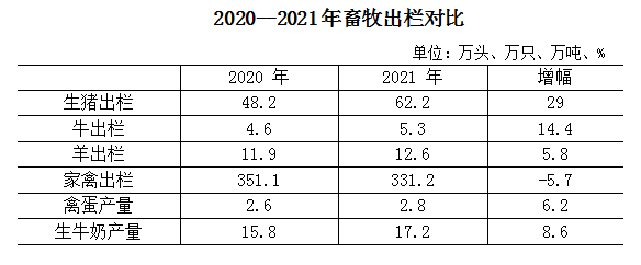 2021年,我市畜牧业产值61.2亿元,同比增长11.8%,占我市农林牧渔业比重为16.2%,在市场拉动下,我市畜禽养殖户养殖热情高涨,我市畜产品产量增幅明显。全年生猪出栏62.2万头,同比增长29%,牛出栏5.3万头,同比增长14.4%,羊出栏12.6万只,同比增长5.8%,家禽出栏331.2万只,同比下降5.7%,禽蛋产量2.8万吨,同比增长6.2%,生牛奶产量17.2万吨,同比增长8.6%。