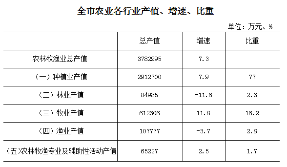 2021年我市实现农林牧渔业总产值378.3亿元,按可比价计算(下同),同比增长7.3%,比上年增加4.8个百分点,增速位居全省第5位,四煤城第3位,高于全省0.2个百分点;两年平均增长4.9%,增速为“十三五”时期以来最高水平。