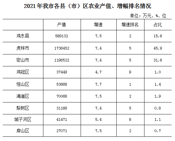 2021年我市农业产值378.3亿元,其中虎林市173.6亿元,增幅7.4%,占我市农业产值比重45.9%,密山市119.7亿元,增幅7.4%,占我市农业产值比重31.6%,鸡东县58.9亿元,增幅7.5%,占我市农业比重15.6%。我市农业构成主要在三县(市),三县(市)农业产值占我市农业产值的93.1%。