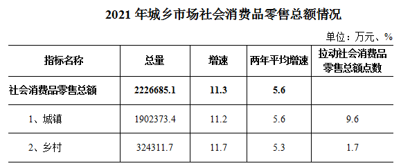2021年,鸡西市城乡市场积极应对疫情影响,市场逐步得到回暖。乡村市场随着商业网点布局的不断规范,市场逐步恢复,乡村市场实现零售额32.4亿元,同比增长11.7%,两年平均增长5.3%,拉动社会消费品零售总额增长1.7个百分点。2021年,鸡西市城镇市场实现零售额190.2亿元,同比增长11.2%,两年平均增长5.6%,拉动社会消费品零售总额增长9.6个百分点,城镇市场的消费集聚效应显著,对市场的拉动作用更加凸显,是市场大幅回升的主动力。