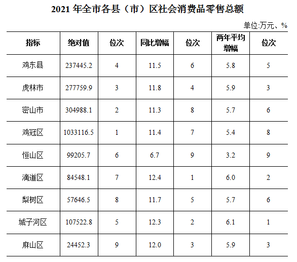 从县(市)区情况看,增速高于全市平均水平的有7个,分别为滴道区、城子河区、麻山区、虎林市、梨树区、鸡东县和鸡冠区,同比分别增长12.4%、12.3%、12.0%、11.8%、11.7%、11.5%和11.4%;与全市增速持平的县(市)区为密山市;增速低于全市平均水平的县(市)区为恒山区,同比增长6.7%,最高增速与最低增速县(市)区之间相差5.7个百分点。从两年平均增速情况看,所有县(市)区消费品市场均恢复到疫情前水平。