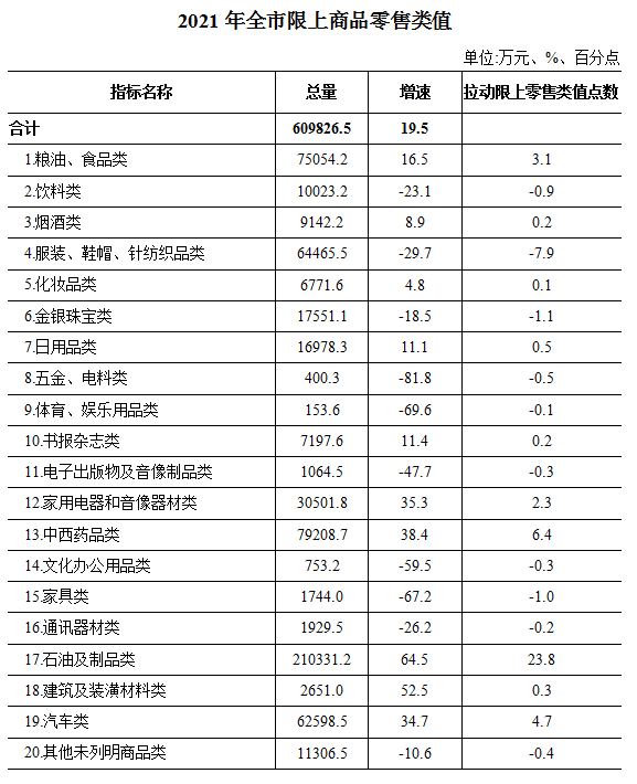 从鸡西市统计的20类限上商品零售类值情况看,2021年呈现“十增十降”的发展态势。从增长类别看,一是基本民生及医疗保健类商品呈现比较稳定的增长态势。限上粮油、食品类实现零售额7.5亿元,同比增长16.5%、中西药品类实现零售额7.9亿元,同比增长38.4%。二是保值及升级类消费品呈现大幅度增长态势。鸡西市限上化妆品类实现零售额0.7亿元,同比增长4.8%、家用电器及音像器材类实现零售额3.1亿元,同比增长35.3%。三是汽车类消费和石油类消费贡献突出。全市实现限上汽车类零售额6.3亿元,同比增长34.7%,拉动限上零售类值增长4.7个百分点。石油及制品类零售额为21.0亿元,同比增长64.5%,拉动限上零售类值增长23.8个百分点。
