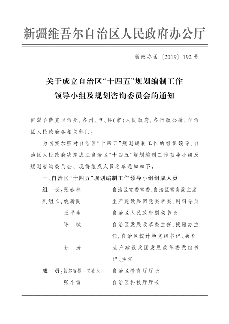 关于成立自治区“十四五”规划编制工作领导小组及规划咨询委员会的通知
