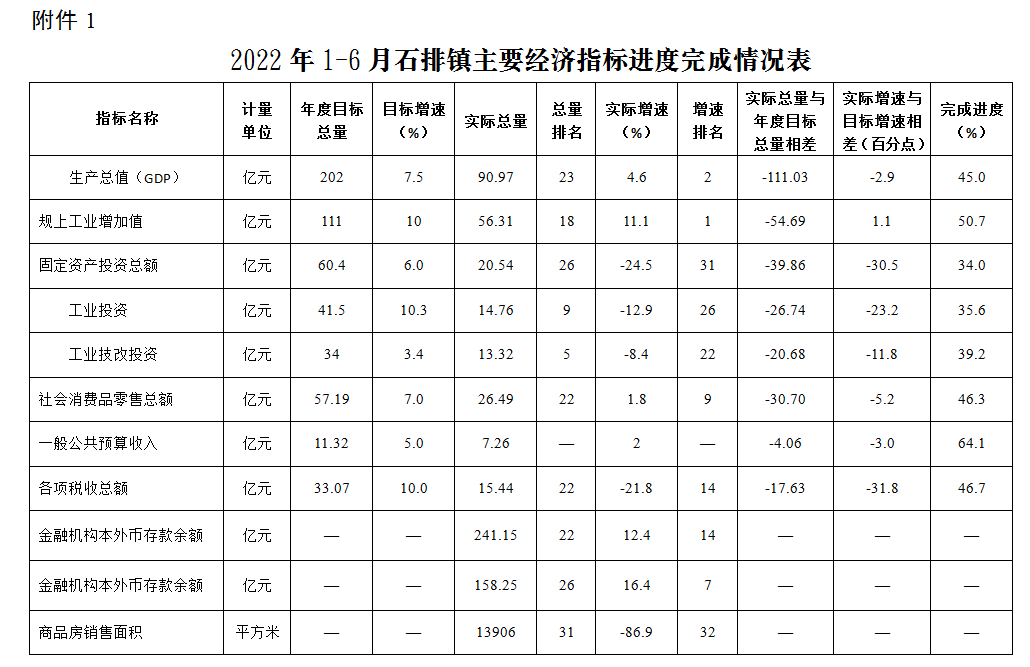 附件:1. 2022年1-6月石排镇主要经济指标进度完成情况表