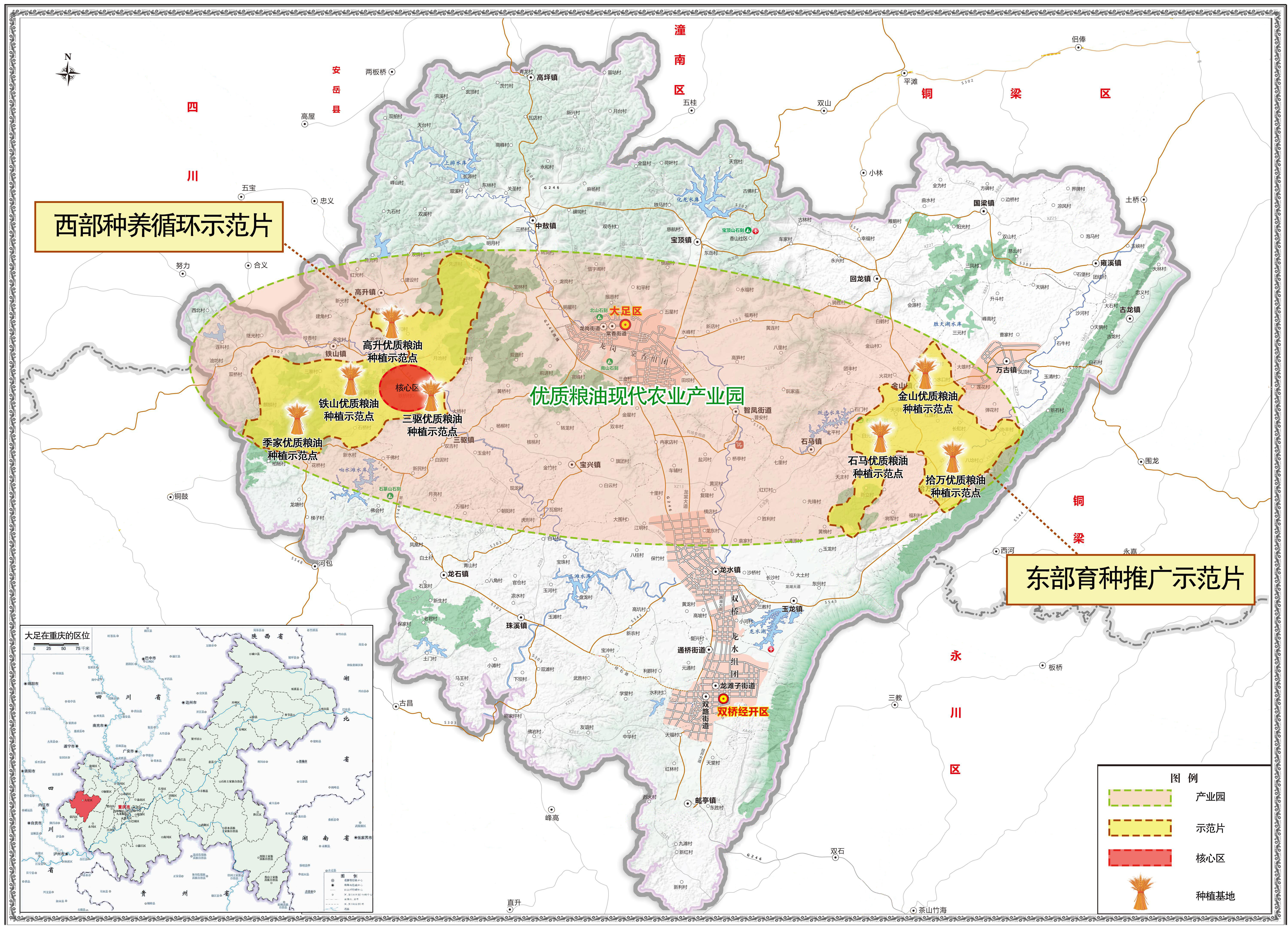 将大足区优质粮油市级现代农业产业园创建为国家级现代农业产业园。按照国家现代农业产业园创建要求,以健康农业为导向,以优质粮油产业为主导,以大足黑山羊产业为重要补充。优化“一园两片七基地”1空间布局,统筹科研、生产、加工、物流、示范、服务、文旅等功能板块,形成“核心驱动、片区联动、基地带动、要素流动”的发展格局。采用“稻鱼共生、稻油菜轮作、种养加、产供销、农工商、产学研用”发展模式,构建“大生产+大加工+大科技+大品牌”全产业链,集中连片开发富硒、富锶绿色有机农产品,推动现代资源要素在产业园高度聚集和有效配置,创新联农带农机制,建设产业特色鲜明、要素高度聚集、生产方式绿色、经济效益显著、辐射带动有力、建设水平领先的现代农业发展平台,打造水稻育种中心、功能性农产品研发中心和农业科普研学示范地、优质粮油精深加工主要地、乡村旅游休闲度假首选地,建成国家高产高效粮油保障基地重点区。